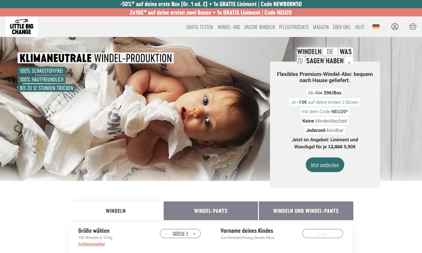Mit einem Mausklick auf den Größenratgeber von Little Big Change können die Kunden außerdem viel einfacher die passende Windelgröße für das jeweilige Alter des Kindes ermitteln und sich so den Kauf ein wenig erleichtern.